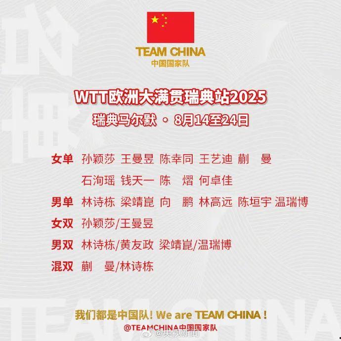 2025年WTT欧洲大满贯瑞典站将开赛,国乒发布参赛名单。