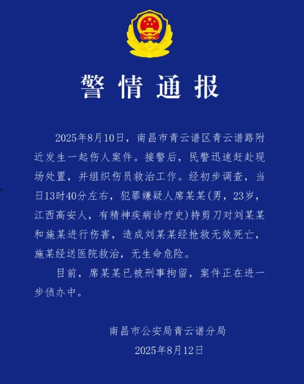 警方通报“南昌景区伤人事件”:23岁男子持剪刀伤人致死,已被刑事拘留,有精神疾病诊疗史。